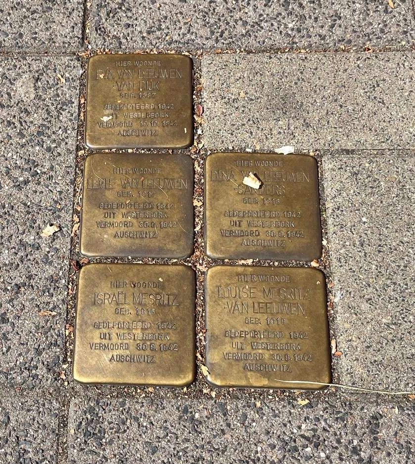 In 1995 heeft woningbouwvereniging ‘De Goede Woning’ de huizen aan het brede gedeelte van de Zeestraat gesloopt en vervangen door nieuwbouw. Ter nagedachtenis aan de familie Van Leeuwen-van Dijk zijn op 25 februari 2016 vijf zogenoemde struikelstenen aangebracht in het trottoir van wat nu Zeestraat 29-31 is, de plaats waar hun woonhuis annex winkel stond en waar heden ten dage restaurant ‘Oostgarden’ is gevestigd. Op de stenen van 10 x 10 cm is een messing plaatje aangebracht waarin de naam, geboortedatum, deportatiedatum en -plaats en datum van overlijden zijn gegraveerd.